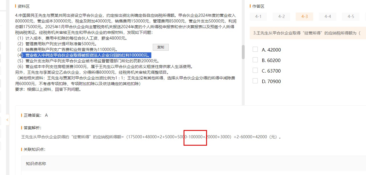 在本题中,10万元分红是甲合伙企业从被投资的法人企业取得的,这部分收入已经作为“营业外支出”列支,但它是非经营性收益,不计入个人合伙人“经营所得”的计税基础,所以要减掉。