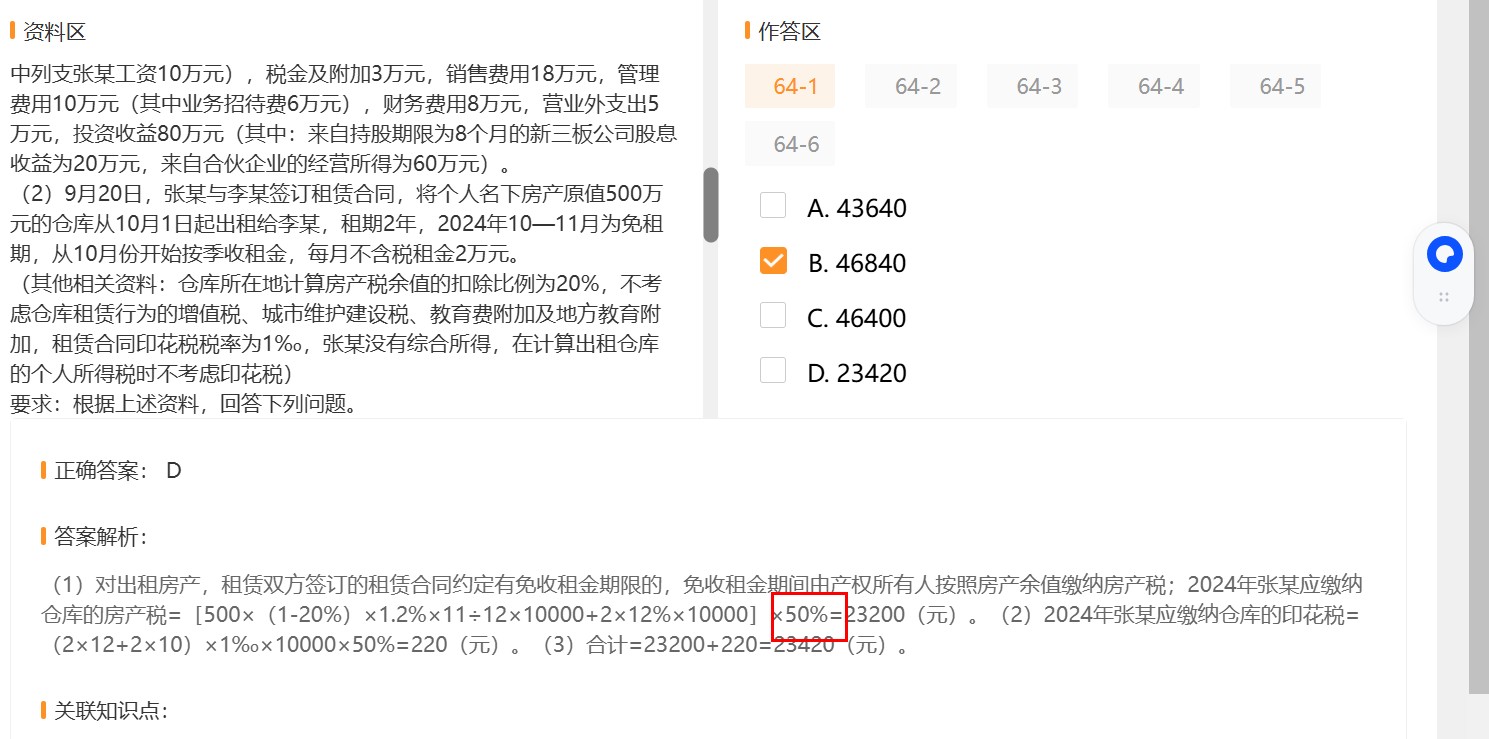 所以,虽然书上写的是“个人出租住房按4%”,但非住房出租也适用减半征收,这是导致乘以50%的原因。
