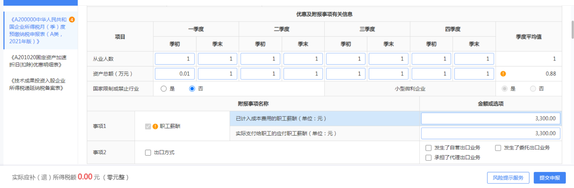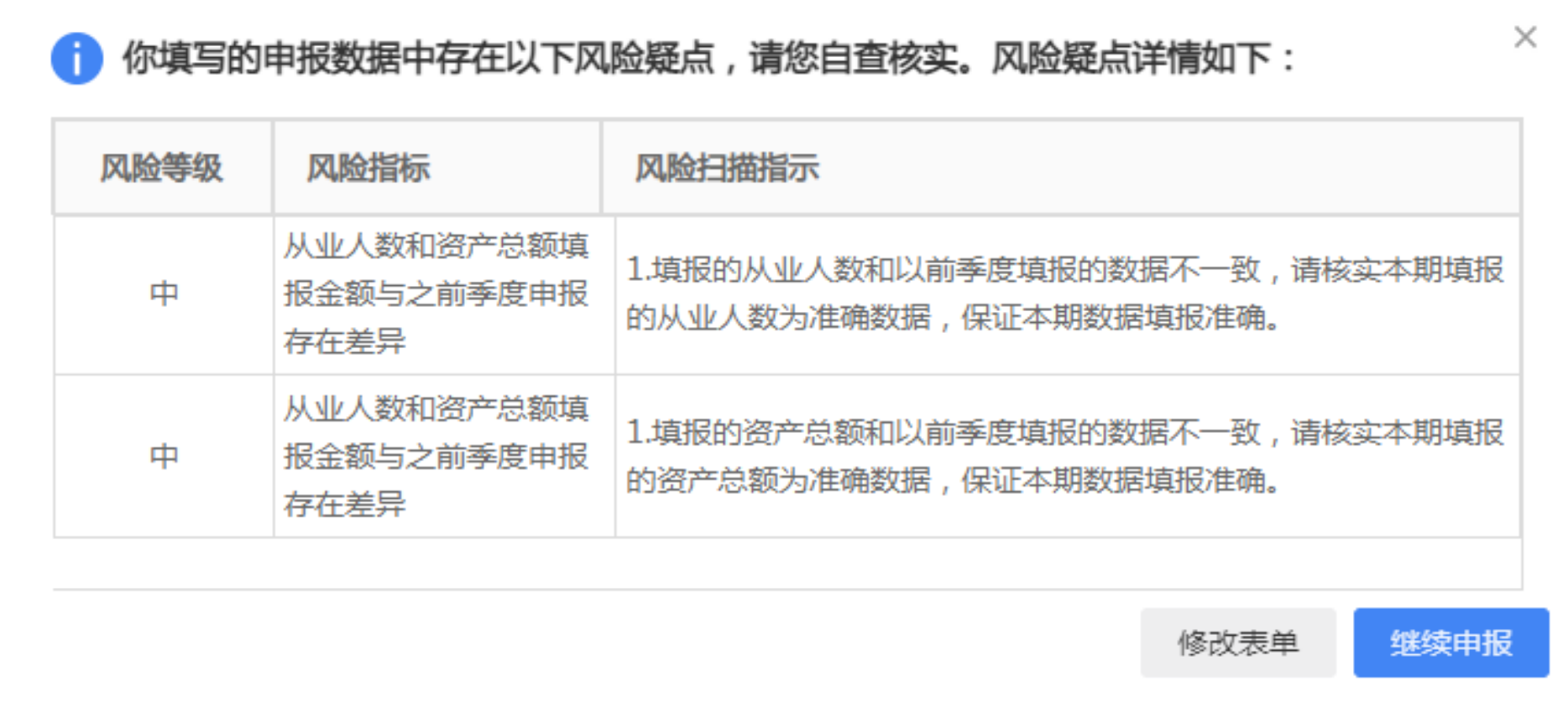 系统提示的风险是“从业人数”和“资产总额”与之前季度填报数据不一致,属于中等风险,需核实准确性。 可以继续申报,但建议确认本期数据是否真实准确,若确实有变动(如人员增减、资产变化),可忽略提示继续申报;若无变动,则应修改至与之前一致,避免后续稽查风险。