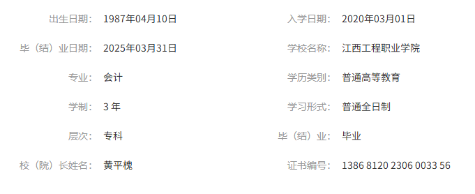 你提供的学历为普通高等教育全日制专科,毕业于江西工程职业学院,属于国家承认的正规学历,且为全日制学习形式,符合中级会计职称报名的基本学历条件。