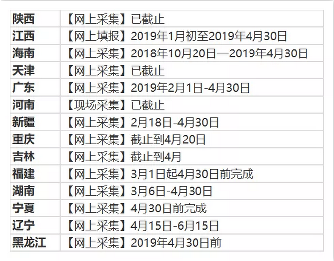 2019年明确要求进行信息采集的地区有:吉林、陕西、江西、海南、天津、广东、河南、新疆、 重庆、福建、湖南、黑龙江。