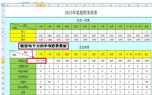 4、接着,在总表里链接到每个月的数据,注意公式的使用,便于后期的更改与调整;