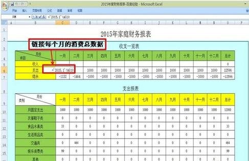 5、在总表里面链接到每个月的数据,同样是采用公式的方法;
