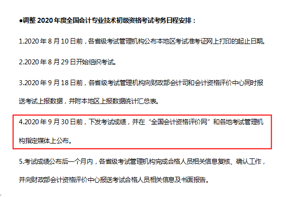 根据最新的考试政策,初级会计考试将于2020年9月30日前,下发考试成绩,并在“全国会计资格评价网”和各地考试管理机构指定媒体上公布。