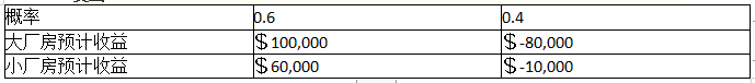 建造任何一种厂房的期望收益是成功的和不成功的预计收益乘以相应的概率,然后进行加总。大厂房的期望收益=0.6×$100,000-0.4×$80,000=$28,000;小厂房的期望收益=0.6×$60,000-0.4×$10,000=$32,000。建造小厂房的选项有最高的期望价值,因而被推荐。综上,本题应选择A选项。【该题针对“期望值”知识点进行考核】