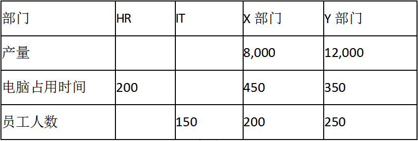 A公司有生产部门分别是X和Y,有HR和IT两个服务部门;HR部门的成本按照员工人数来分配,IT部门的成本按照电脑占用时间分配;HR部门年成本$150,000,IT部门年成本$200,000;以下是关于四个部门的相关数据: