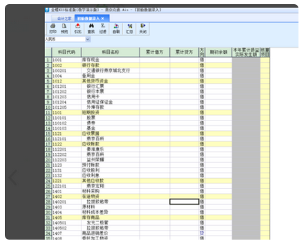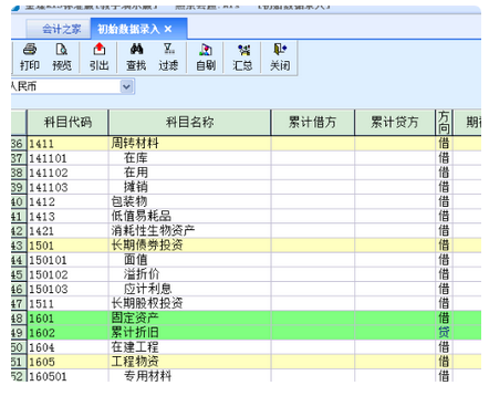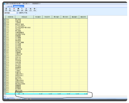 3、初始数据录入界面分科目代码、科目名称、累计借方、累计贷方、期初余额等。黄色区域为自动累计,白色区域为数据输入区。