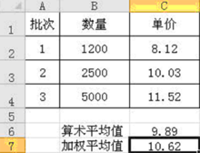 或者输入公式:=SUM(B2:B4*C2:C4)/SUM(B2:B4)