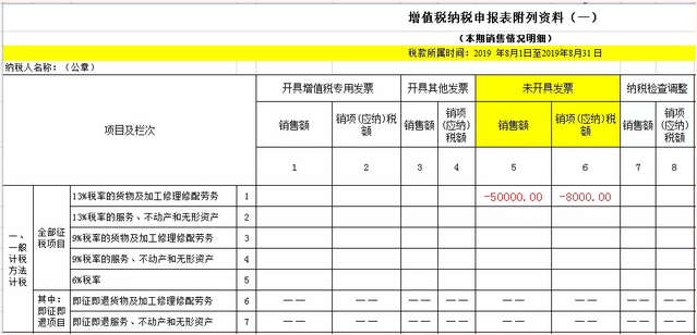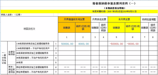 第二步 :根据《国家税务总局关于调整增值税纳税申报有关事项的公告》(国家税务总局公告2019年第15号)第三条,纳税人申报适用16%、10%等原增值税税率应税项目时,按照申报表调整前后的对应关系,分别填写相关栏次。所以将这笔金额、税额填入8月税款所属期的《增值税纳税申报表附列资料(一)》第1行“一般计税方法计税-全部征税项目-13%税率的货物及加工修理修配劳务-开具增值税专用发票”相关列次。