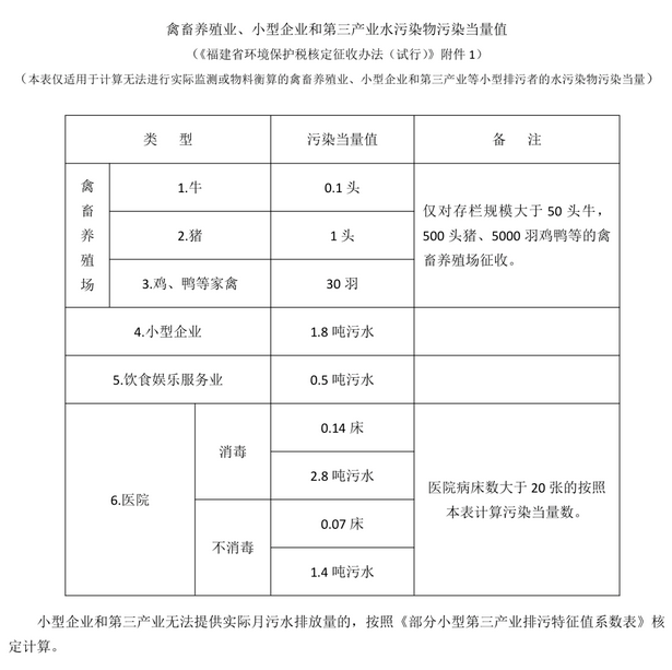 根据《福建省环境保护税核定征收办法(试行)》第四条,禽畜养殖业和医院水污染物应纳税额,按照《禽畜养殖业、小型企业和第三产业水污染物当量值》核定计算;小型企业和第三产业水污染物应纳税额,能够提供实际月污水排放量的按照《禽畜养殖业、小型企业和第三产业水污染物当量值》核定计算。