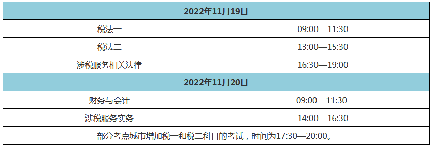 2022年税务师考试时间为11月19日、20日,各科目考试时间安排如下表。