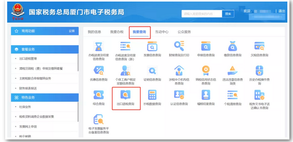 1、进入电子税务局- 点击“我要查询”- 出口退税管理,如下图:
