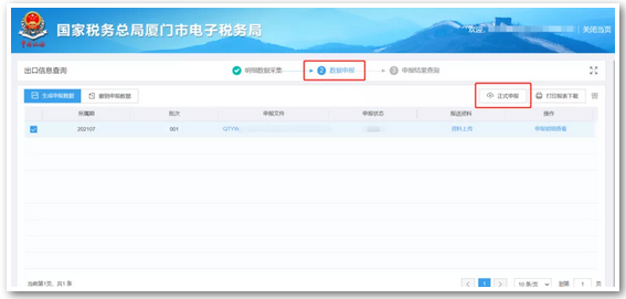 4、点击“数据申报”- 勾选所要申报的数据 – 点击“正式申报”,待税务机关审核完成后系统会自动发起补发流程,如下图: