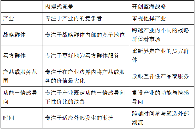 重建市场边界就是要准确地挑选出具有蓝海特征的市场机会,有六条基本法则(路径框架)可供选择,如下表所示。从肉搏式竞争到蓝海战略选项AD专注于肉搏式竞争,选项BC才是开创蓝海战略的选择。