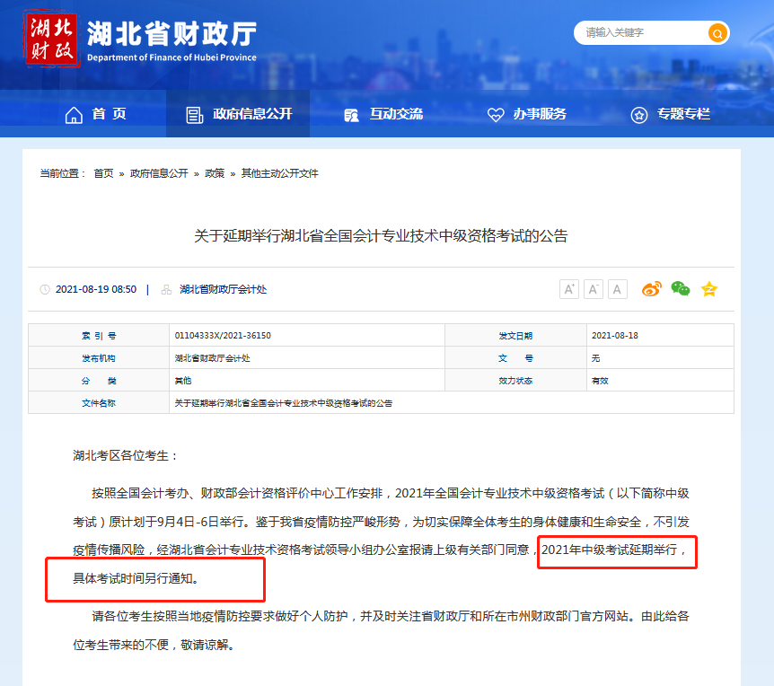 按照全国会计考办、财政部会计资格评价中心工作安排,2021年全国会计专业技术中级资格考试(以下简称中级考试)原计划于9月4日-6日举行。鉴于我省疫情防控严峻形势,为切实保障全体考生的身体健康和生命安全,不引发疫情传播风险,经湖北省会计专业技术资格考试领导小组办公室报请上级有关部门同意,2021年中级考试延期举行,具体考试时间另行通知。